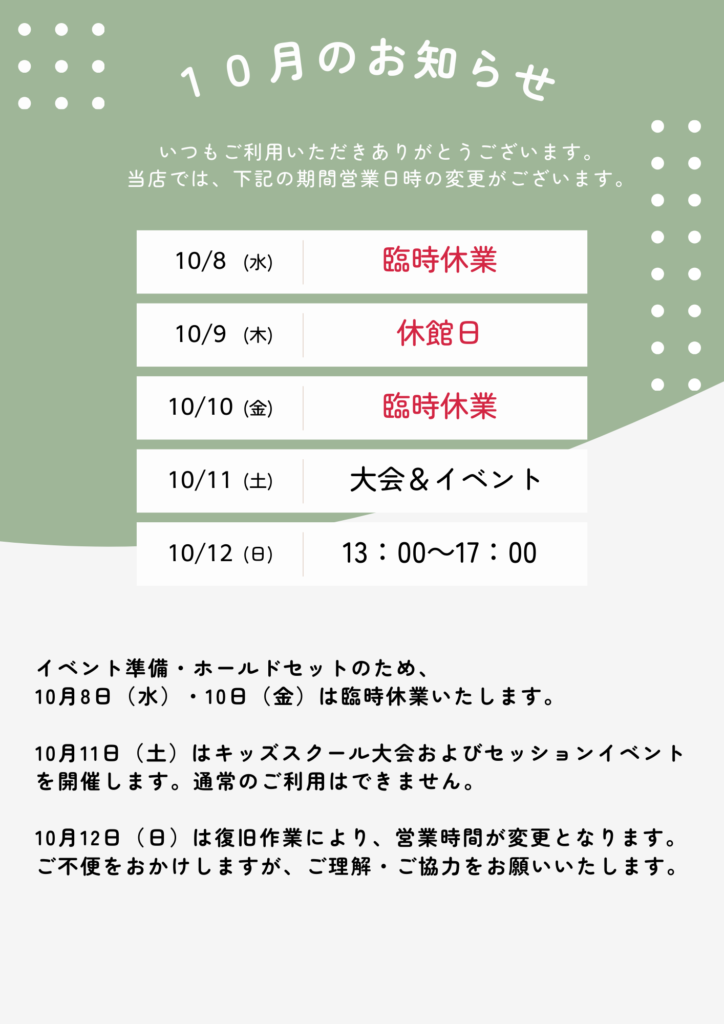10/8(水)~10/10(金) イベント準備・ホールドセットの為お休み 10/11(土) キッズスクール大会・セッションイベント ※通常利用はできません 10/12(日) 13:00~17:00