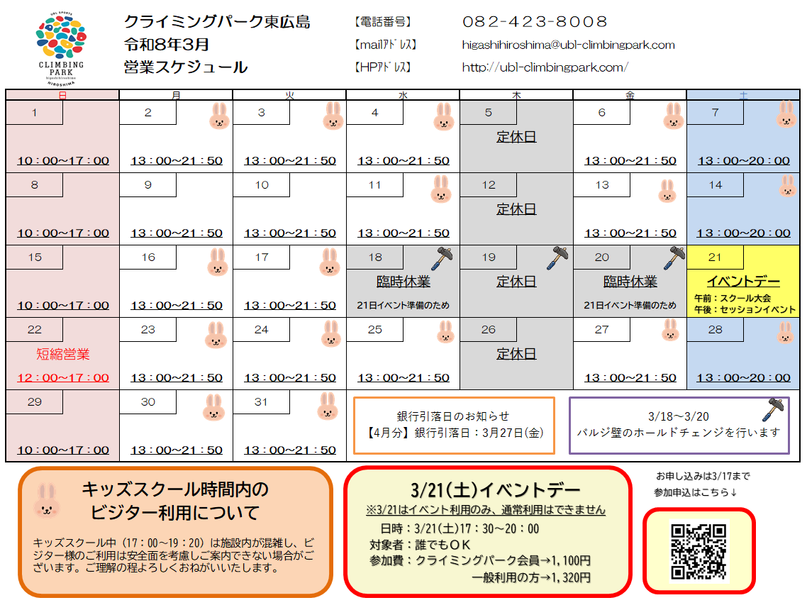 3月営業スケジュールのお知らせです。
